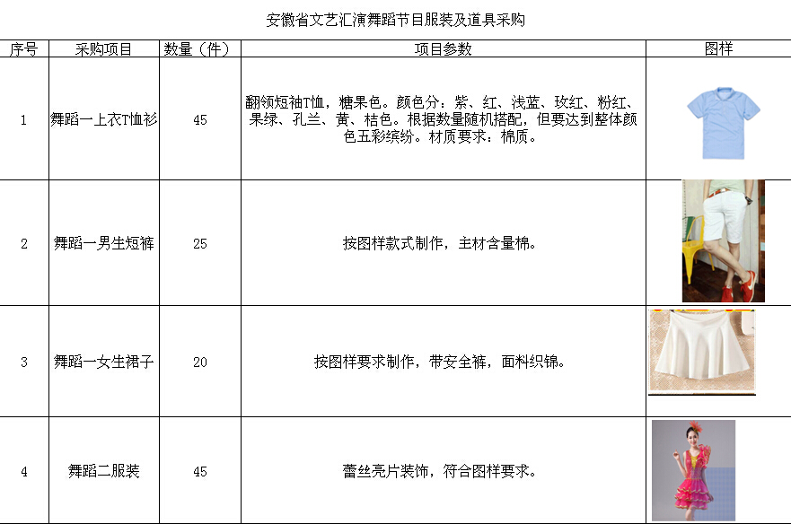 我院文艺展演于2014年12月13日在芜湖县一中体育场举行,现需要招标采购演出服装及道具。具体要求见附表。