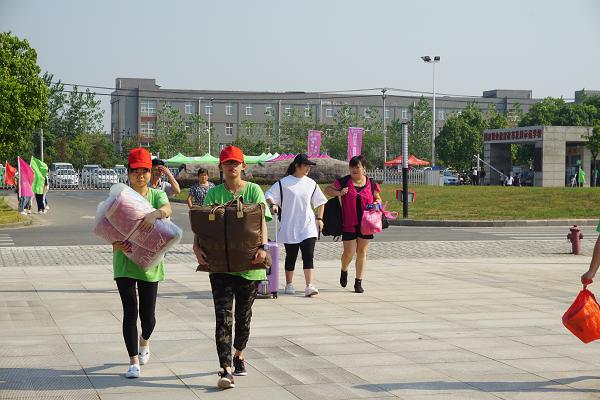 2016级新生在家长的陪伴下,拖着行李迈入校园