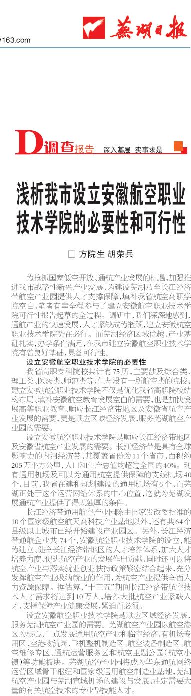 为抢抓国家低空开放、通航产业发展的机遇,加强推进我市战略性新兴产业发展,为建设芜湖乃至长江经济带航空产业园提供人才支撑保障,填补我省航空高职学院空白,笔者有幸全程参与了建立安徽航空职业技术学院可行性报告起草的全过程。调研中,我们深深地感到,通航产业的快速发展,人才紧缺成为瓶颈,建立安徽航空职业技术学院势在必行。而芜湖经济区域优越,产业基础扎实,办学条件满足,在我市建立安徽航空职业技术学院有着良好基础,具备可行性。