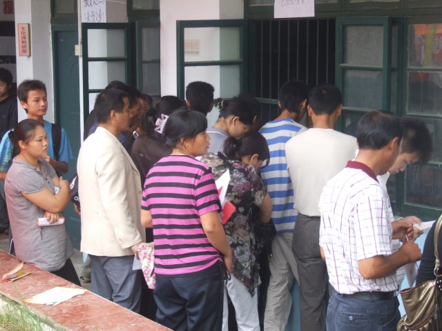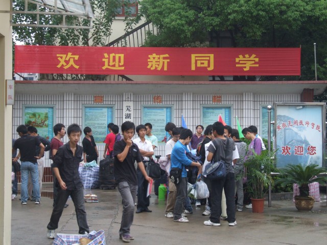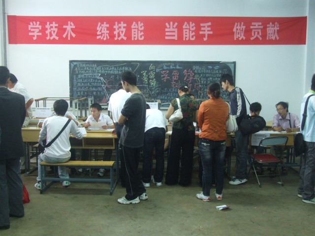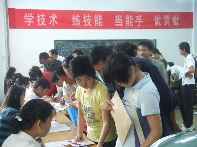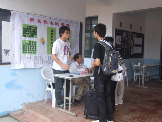 报名现场看到,迎新的横幅引人注目,宣传标语催人奋进。五颜六色的旗帜迎风招展,预示着新学期会有 更多的精彩。教职工热情忙碌,耐心细致地帮助学生办理入学手续。学生们兴高采烈,家长们也是面带笑容。