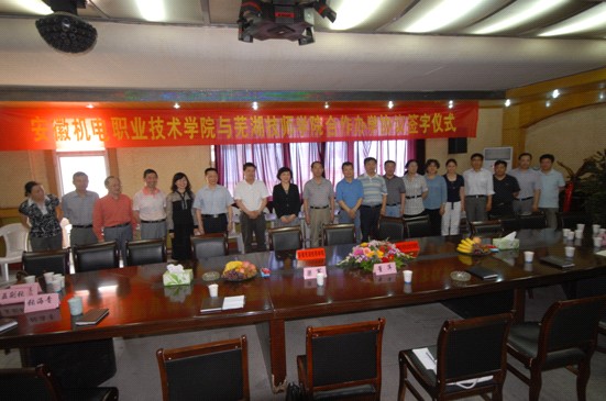 为共享和充分利用双方办学资源,更好地服务地方经济社会发展,经多次协商,达成共识,2010年6月2日上午,安徽机电职业技术学院与安徽芜湖技师学院合作办学协议签字仪式在我院举行。市人力资源和社会保障局党组书记、局长董萍,副局长梁军,安徽机电职业技术学院、安徽芜湖技师学院党政领导班子全体成员及有关部门负责同志参加了签字仪式,签字仪式由安徽芜湖技师学院党委书记张海青主持。