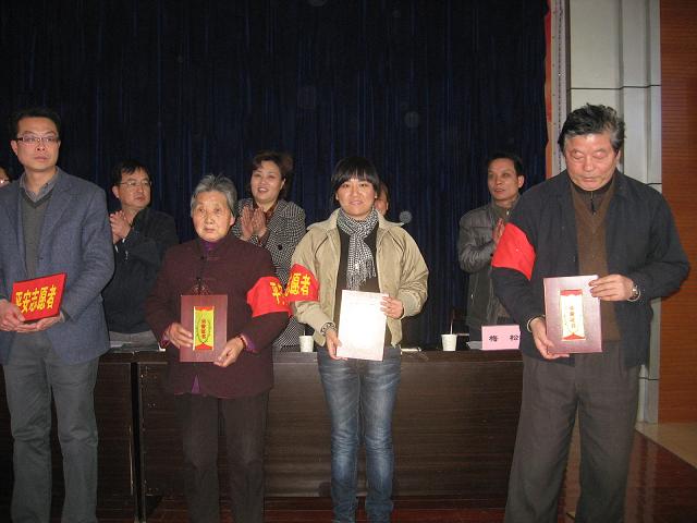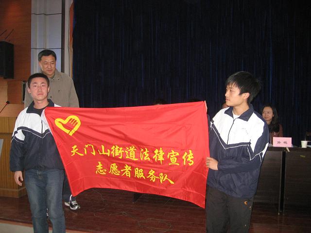 会上我院团委被授予天门山街道2010年平安志愿服务先进集体称号,刘琪副区长亲自颁奖并为学院志愿者代表张璟老师佩戴袖章。大会还向我院学生会等多家组织授“天门山街道法律宣传志愿者服务队”队旗。会后我院学生代表和其他与会志愿者一道参加了天门山派出所举办的治安防范知识培训。