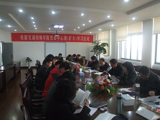 11月29日下午,安徽芜湖技师学院党委中心组召开扩大会议集中学习了胡锦涛在十八大上所作的题为《坚定不移沿着中国特色社会主义道路前进为全面建成小康社会而奋斗》的报告和《中国共产党章程(修正案)》等内容。会议由党委书记朱正飞主持,院党委中心组成员及各处室、系部负责人和各党支部书记参加了学习。