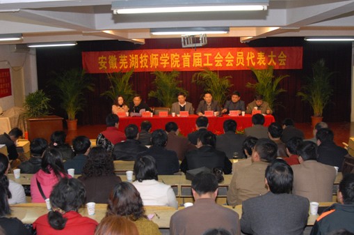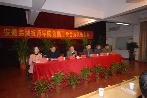 4月16日下午2:30,安徽芜湖技师学院首届工会会员代表大会在庄严的《国歌》声中隆重开幕。院长方院生同志、党委书记张海青同志、纪委书记陈兴亮同志、党委委员蒋光裕同志等与53名会员代表出席了大会。安徽师范大学教育工会、安徽工业大学工会、安徽工程大学教育工会、皖南医学院教育工会、安徽商贸职业技术学院教育工会、芜湖电大工会、安徽中医药高等专科学校教育工会、安徽机电职业技术学院工会、芜湖职业技术学院工会、芜湖信息技术职业学院工会等省市高校工会发来了贺信。