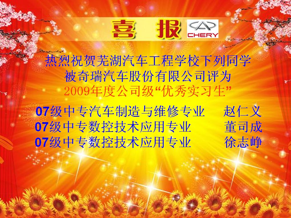 热烈祝贺我院三名学生被评选为2009年度奇瑞公司级的优秀实习生