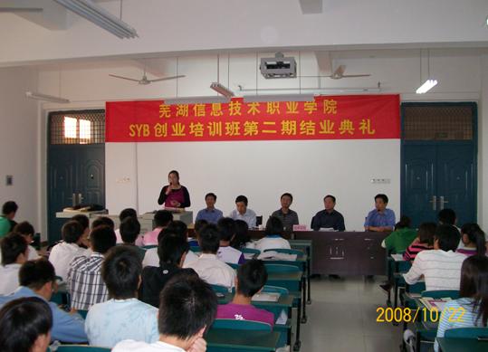 在我市喜迎第二届动漫产业交易会来临之际,10月22日下午,由共青团芜湖市委、芜湖技师学院、弋江区劳动和社会保障局、弋江区团委和芜湖信息技术职业学院联合举办的大学生SYB创业培训班结业典礼在信息学院东一楼多媒体教室隆重举行。